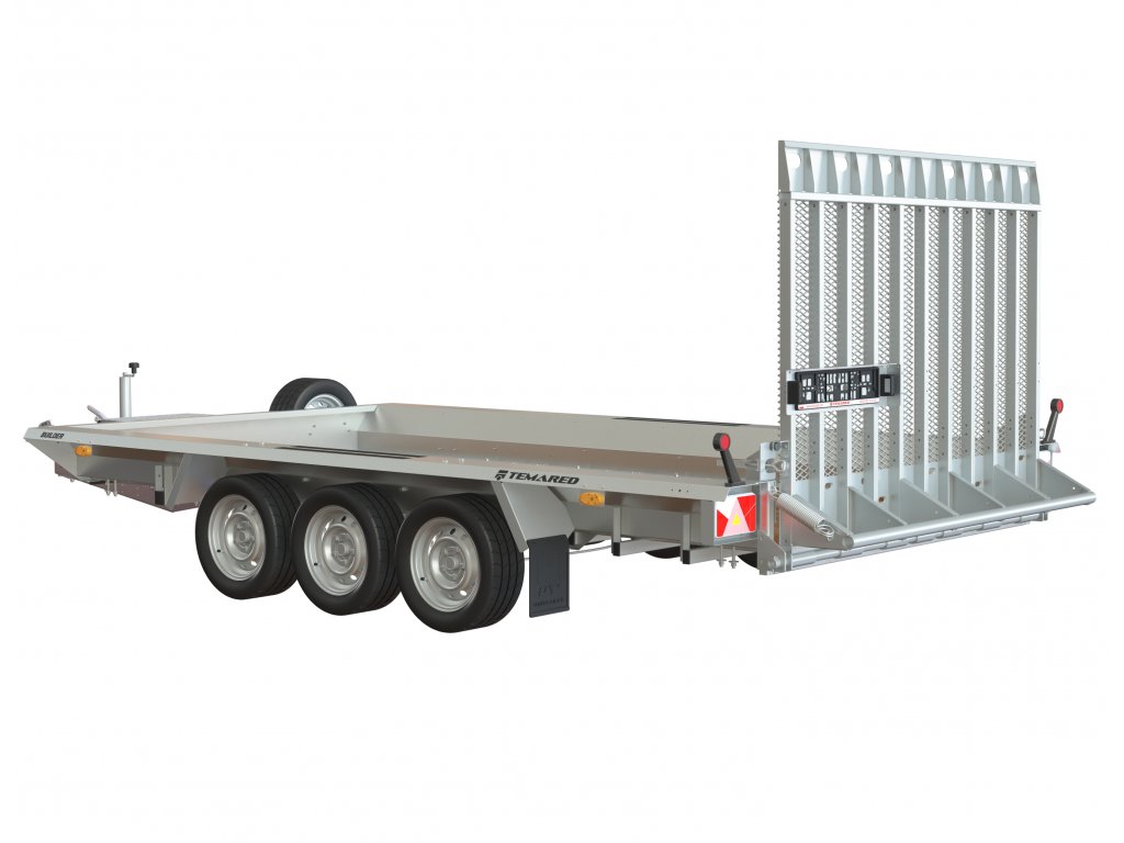 Transportní přívěs TEMARED BUILDER-3 3516/3 S 3,5T určený pro přepravu bagru, mini bagru, zahradní techniky a speciální techniky. Přepravní přívěs s celkovou hmotností od 2500 do 3500 kg! Mimořádně pohodlné naložení díky rampě, která vám umožní rychle a bezpečně naložení do přívěsu!