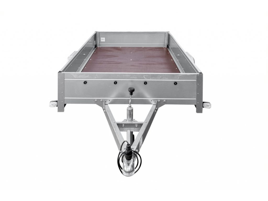 Konstrukce s pozinkované oceli, prolisované bočnice lisovaného za studena - větší tuhost a pevnost, ošetřeno galvanickým pozinkováním, kvalitní náprava AL-KO, uchycená pomocí třech šroubů v místě uchycení zesílená L profilem, příčky pod podlahou a kvalitní panty pro výklopné časti přívěsu.